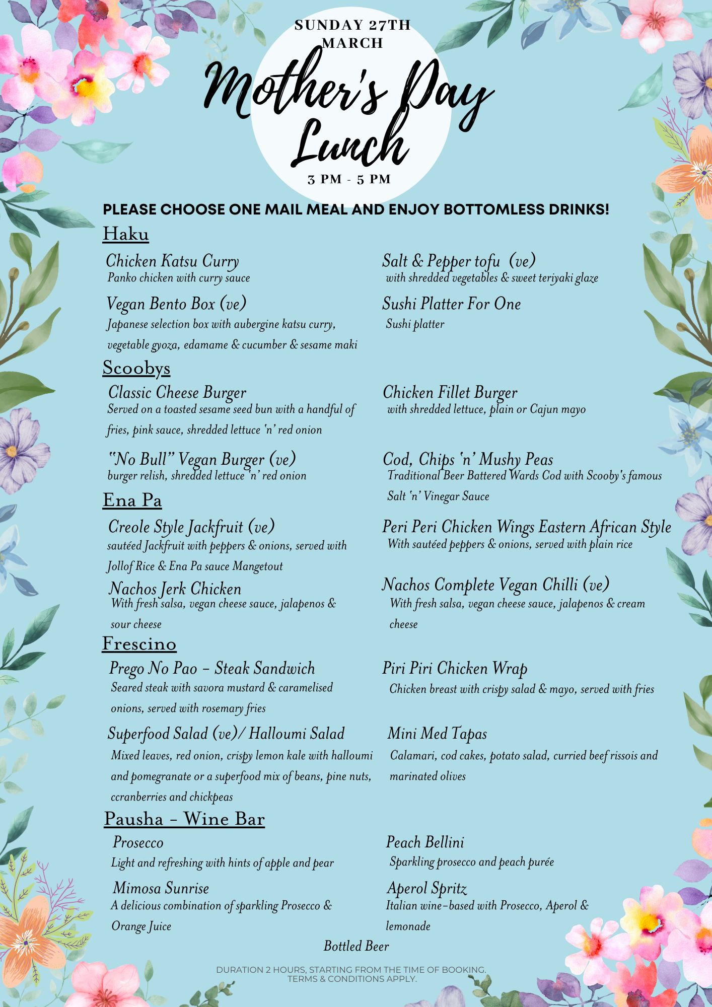 Join us for Mother's Day Bottomless Brunch, at this event you can enjoy bottomless (enter drinks), a meal from one of our fabulous vendors and live entertainment.